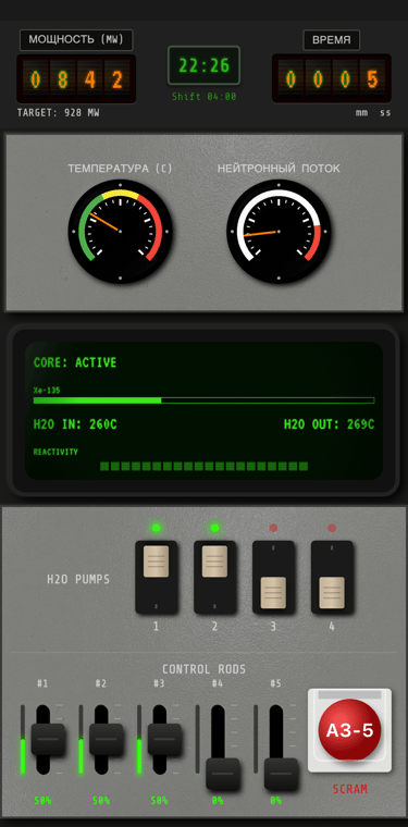 Step into the control room of a Soviet RBMK-1000 nuclear reactor, where every toggle and slider determines the fate of the plant. As the operator, you must balance power output against rising temperatures and neutron flux, while meeting all the demands from Moscow.